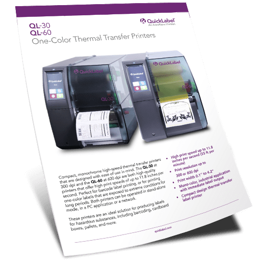 QL-30热转印标签打印机具有中对齐介质和高打印速度,是单色独立或集成标签应用的最佳选择。 QL-30 可以在300 dpi分辨率情况下,打印速度高达11.8ips。QL-30能够打印长度小至4毫米的标签,精度高,打印速度快。